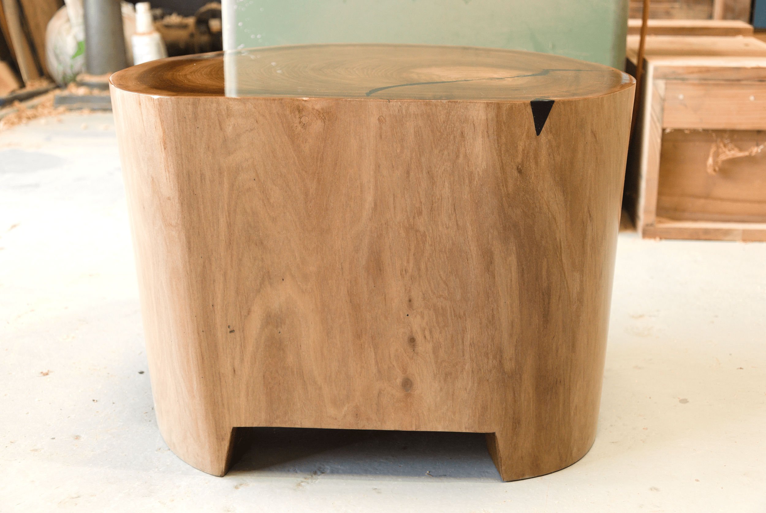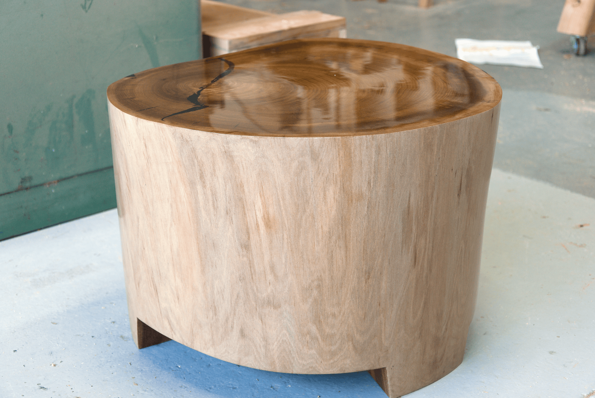 Only as much design as was needed to make it functional, was imposed on this piece. This monolithic method really allows the wood itself to become the focal point. It’s satin sides with mirror like top gives great contrast, and pushes the eye to examine the history captured in the growth rings.