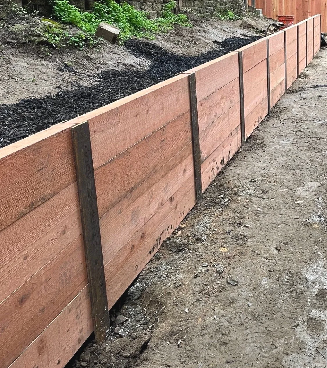 So often retaining walls are strictly utilitarian, or at best, the client has the standard 2 or 3 uninspired designs to choose from. I designed this retaining wall to be sleek and strong as well as an attractive addition to their outdoor space. I supplied the custom milled redwood inserts as well.