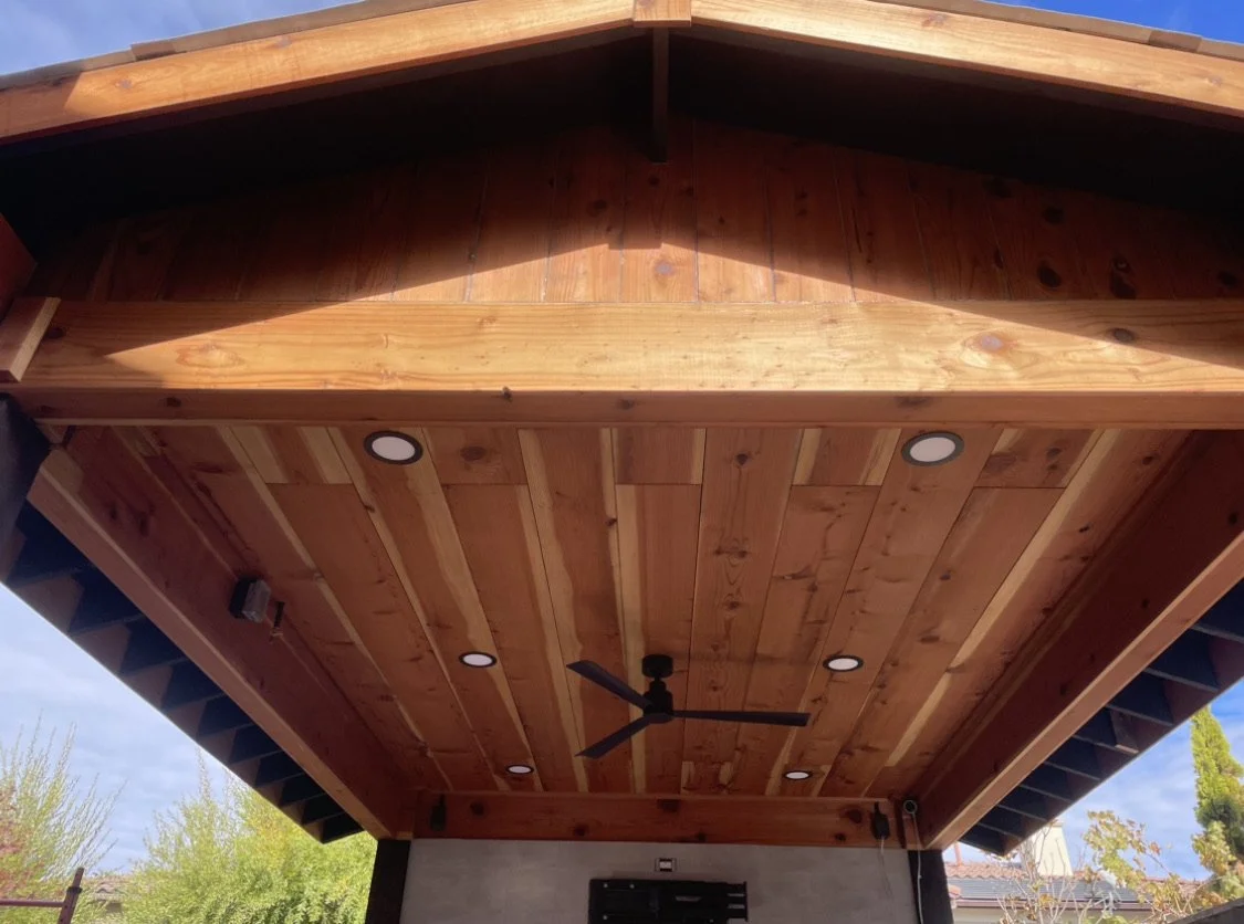 Having a sawmill allows me to bring my clients’ design opportunities they could not get with off the shelf lumber. Seen here in the ceiling are redwood boards 11” wide and 15’ long, almost the full ceiling span. It makes for a bold look where the ceiling really becomes the showpiece of the entire space.