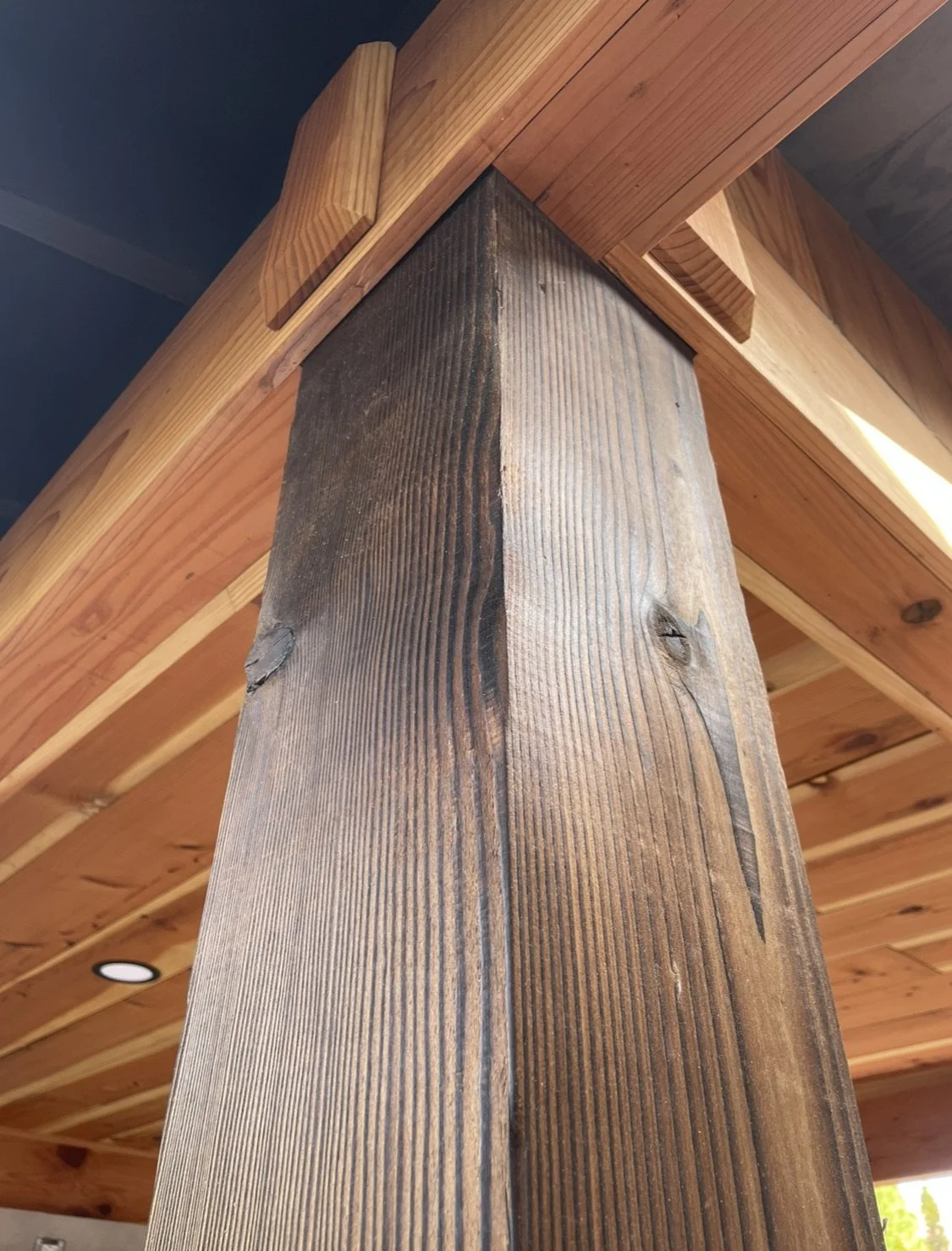 The massive columns were treated in a traditional method called yakisugi, which involves burning the surface, then burnishing back and oiling. It shows off the grain and in sunlight gives the wood an almost metallic sheen. It has an added benefit of increasing the wood’s resistance to rot and insects.